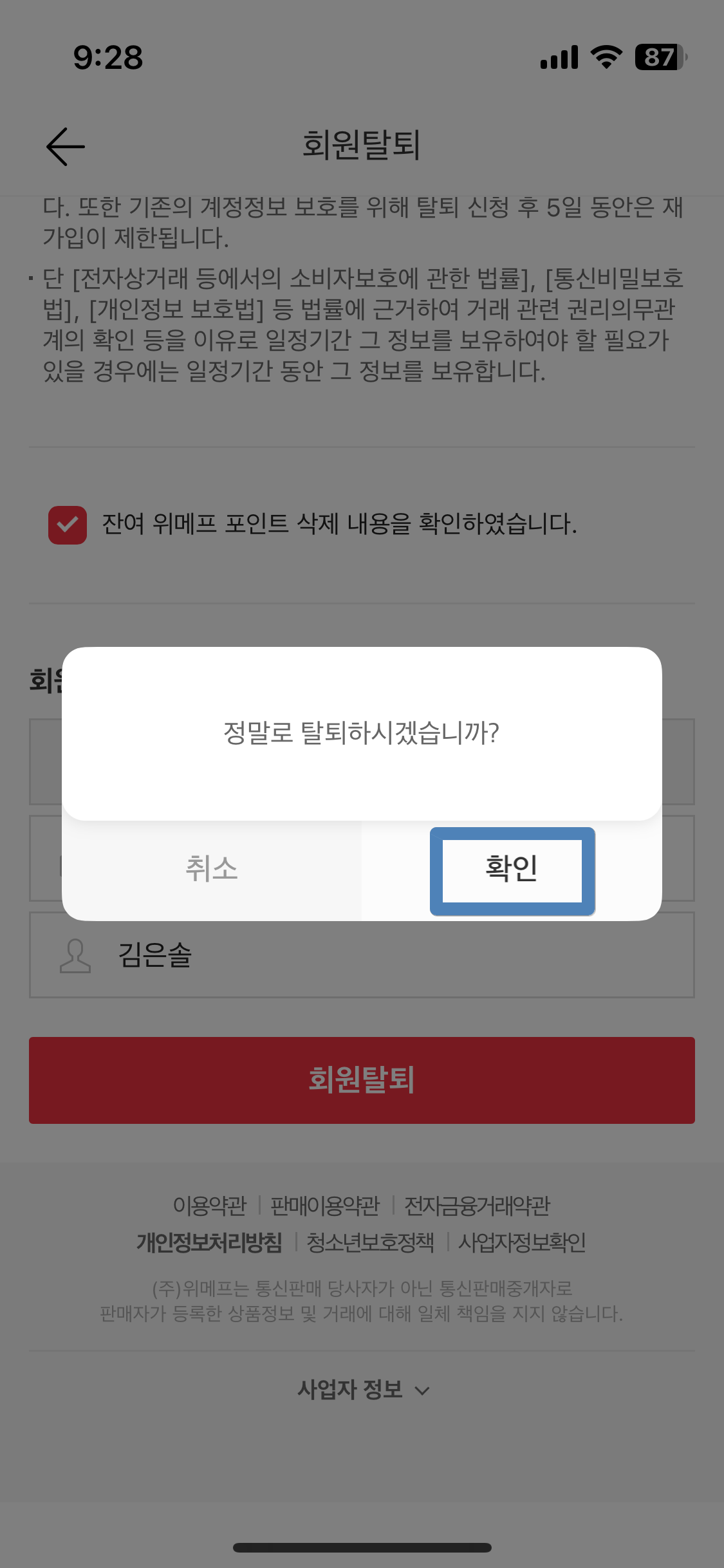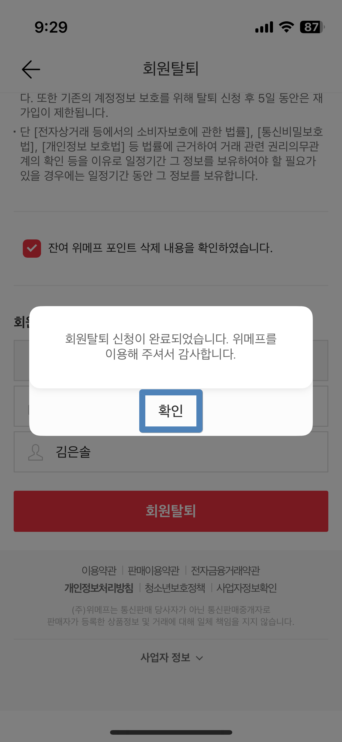 확인을 누르면 위메프 회원탈퇴가 모두 완료됩니다.