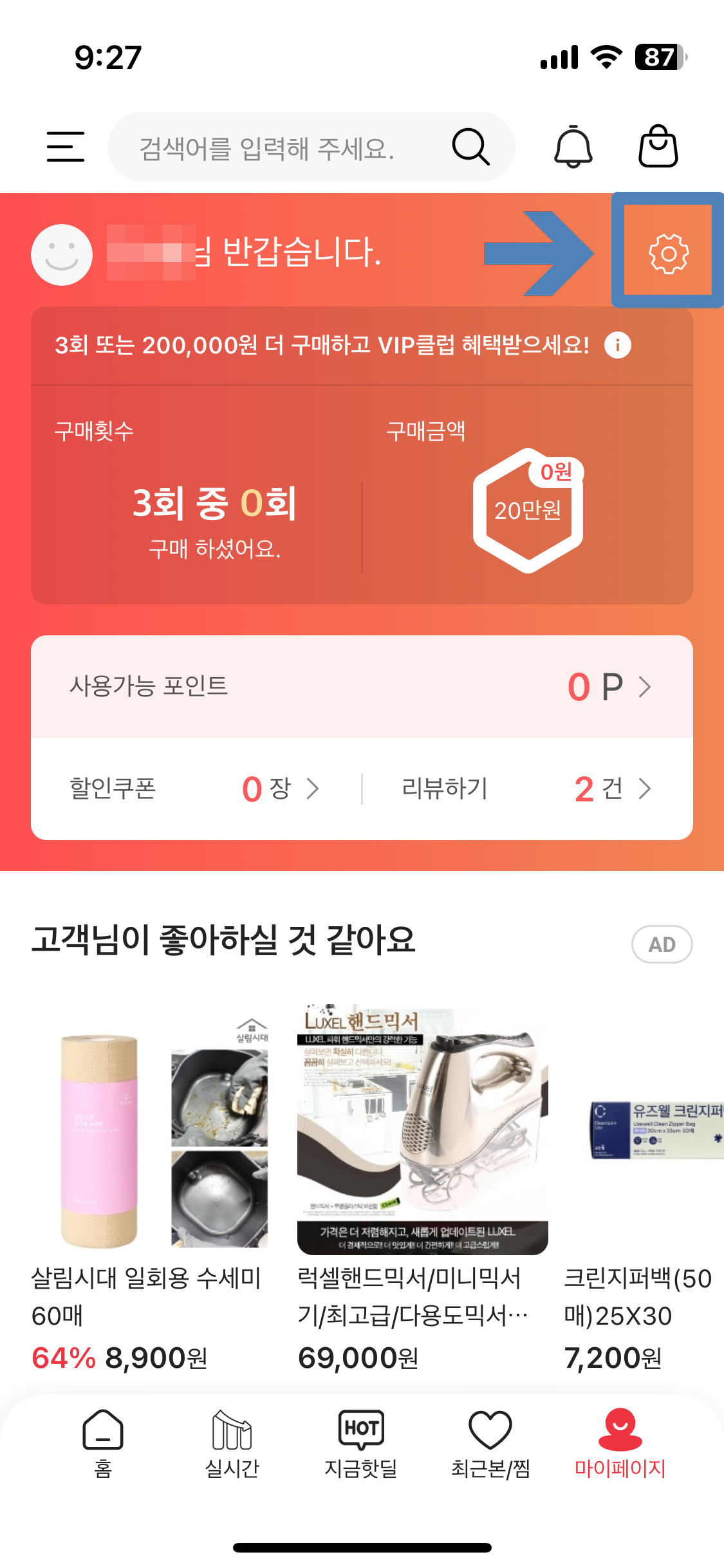 로그인하셨다면 오른쪽 상단의 설정 아이콘을 클릭하고,