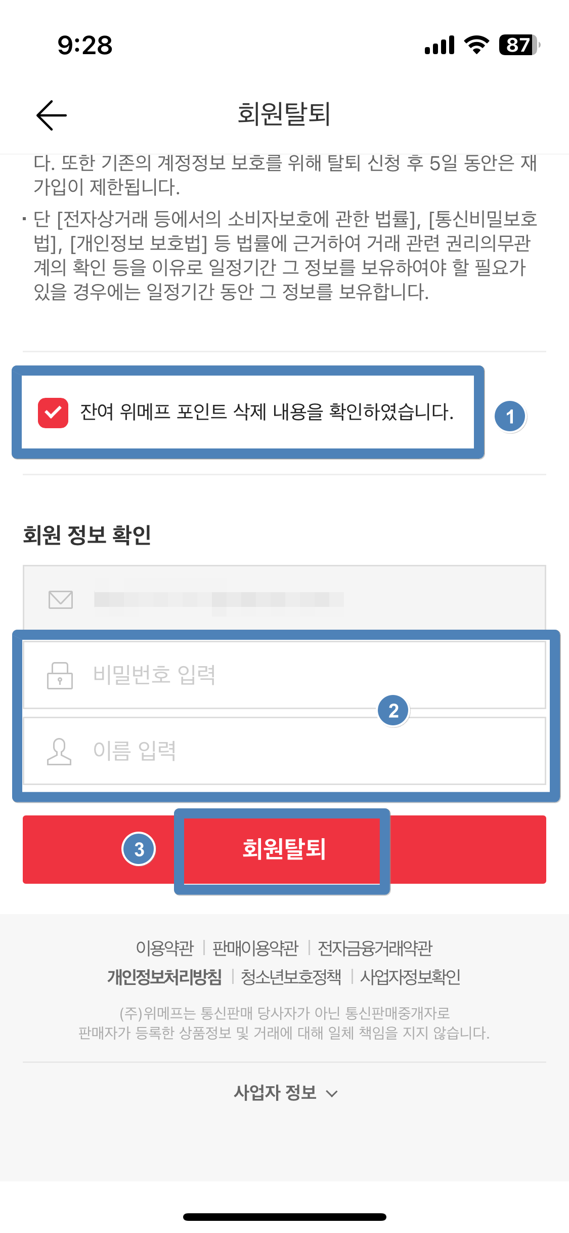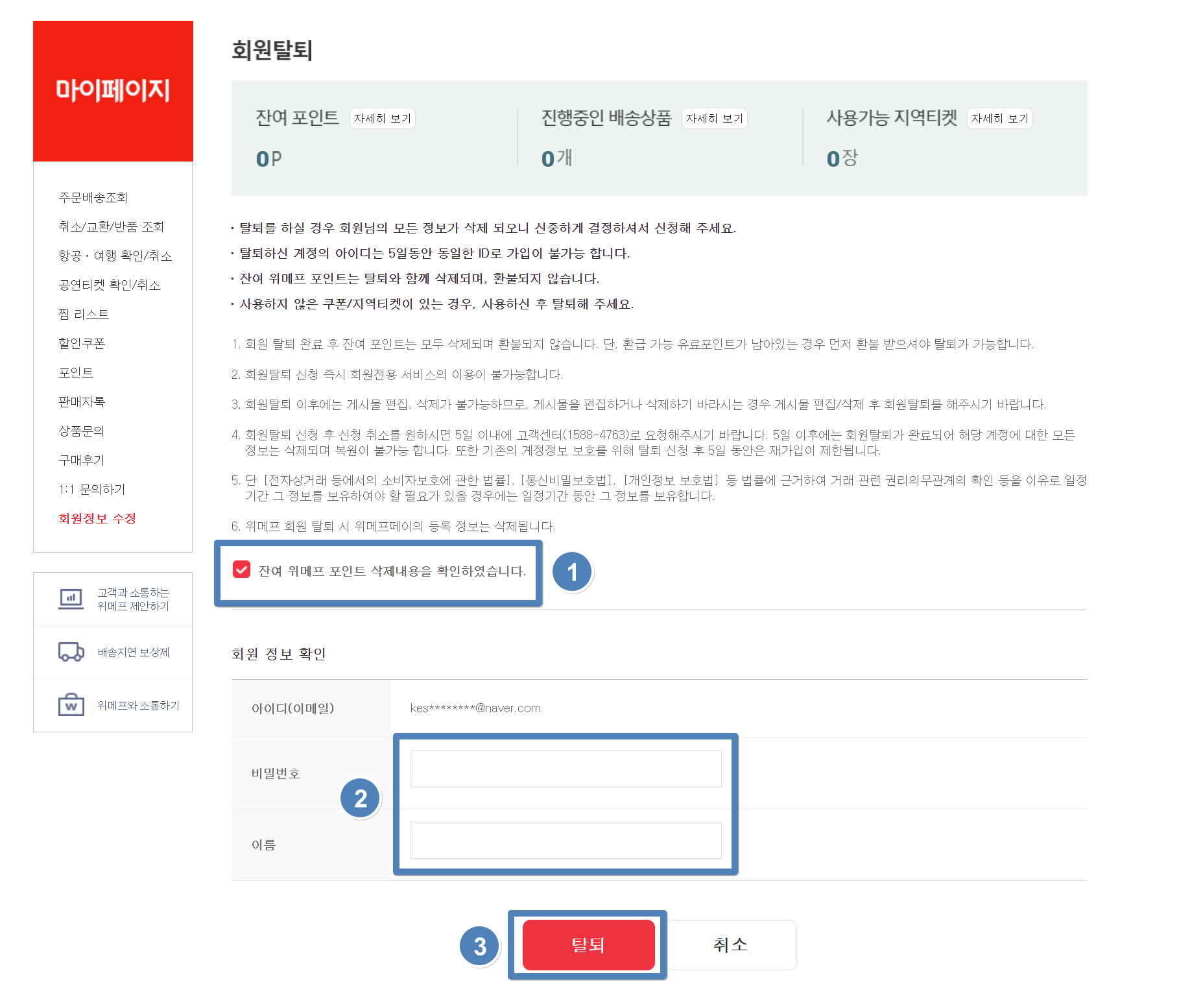 다음 페이지에서 잔여 위메프 포인트 삭제 내용에 대해 확인했음을 체크하고, 비밀번호와 이름을 기입한 후, 탈퇴 버튼을 클릭하면 끝!