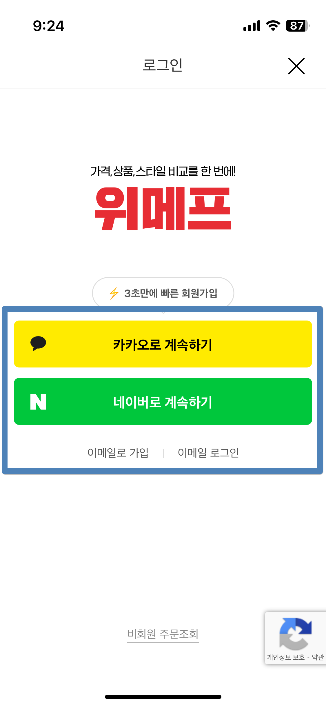 모바일에서는 PC에서와 다르게 이메일 로그인 뿐만 아니라 간편로그인(카카오, 네이버)이 가능한데요.