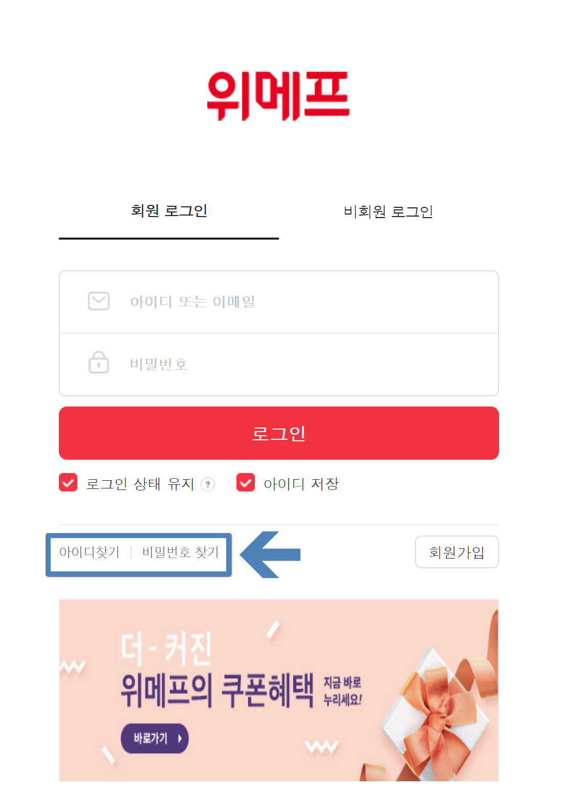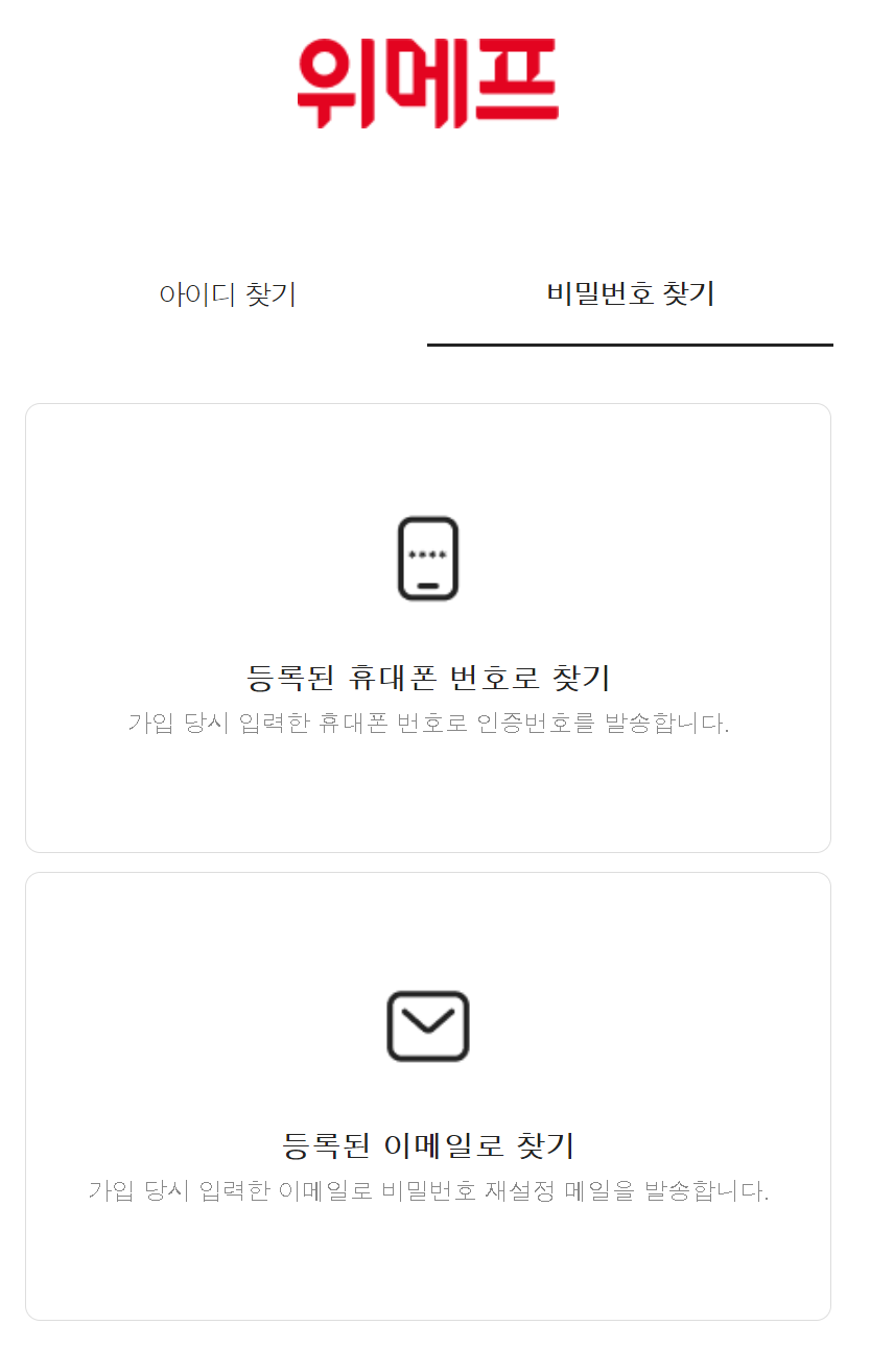 위메프 아이디와 비밀번호 찾기 시, 휴대폰 번호 또는 이메일 주소가 필요합니다.