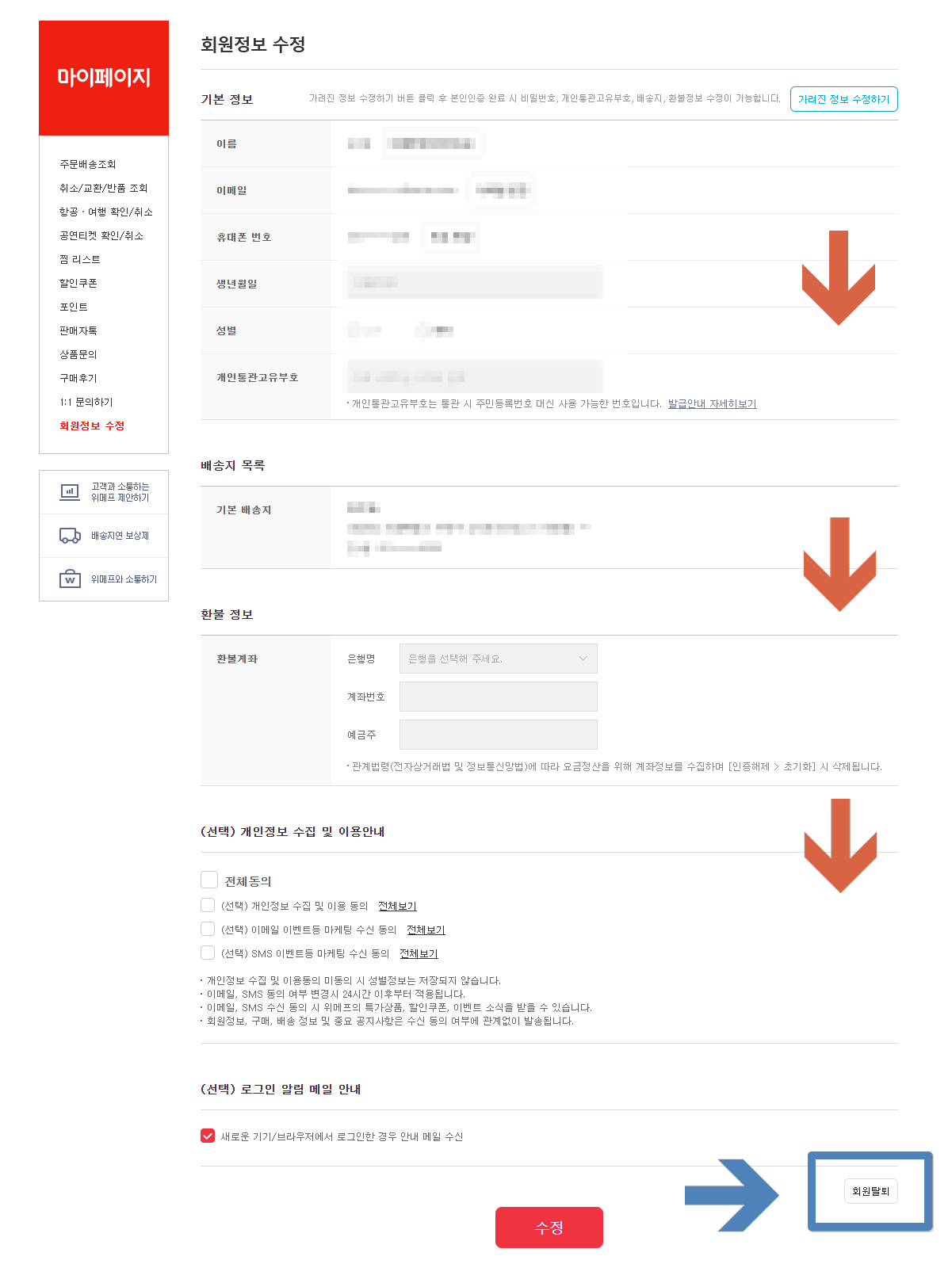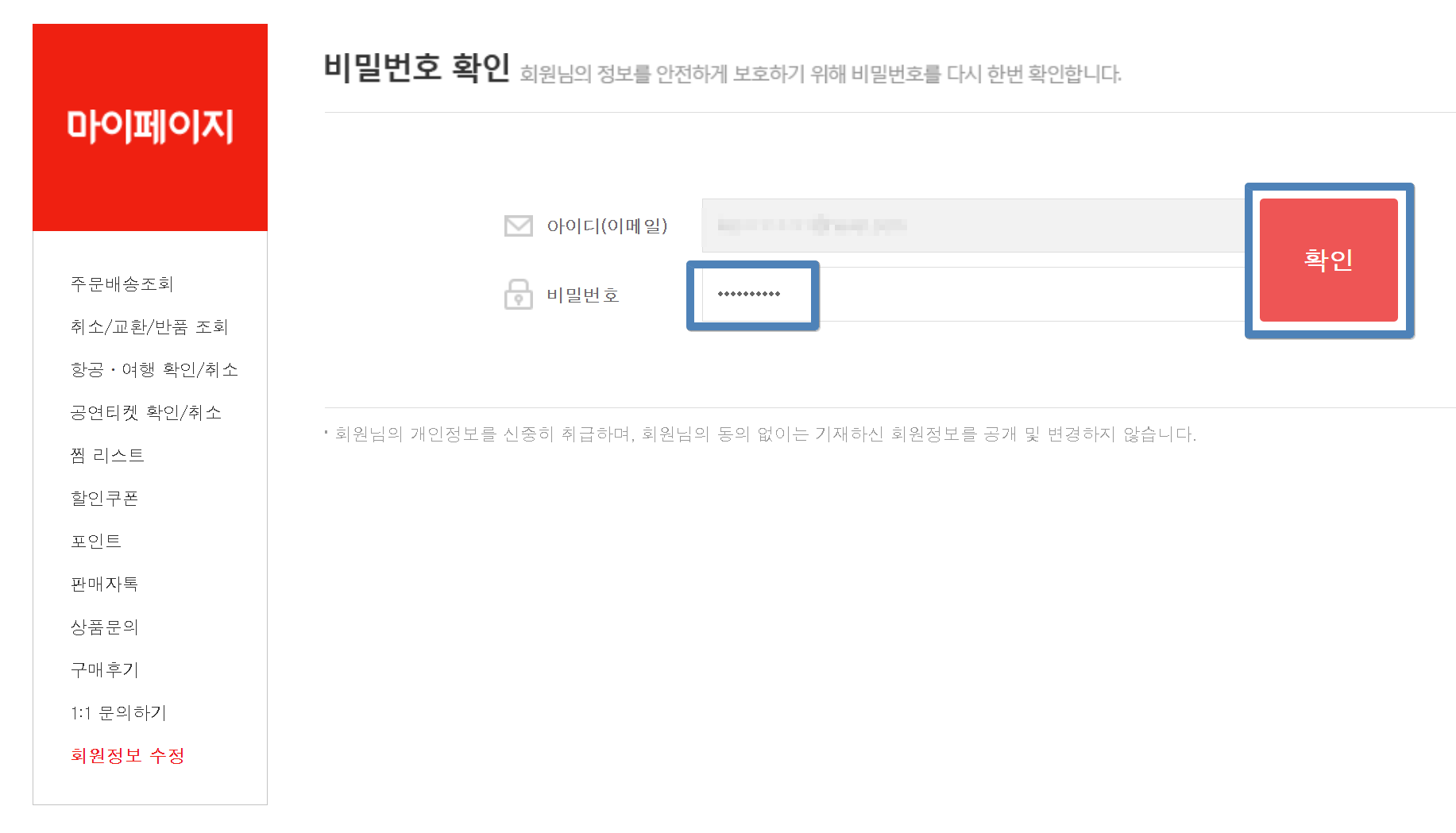 로그인을 하셨다면, 우측 상단 마이페이지 - 회원정보수정을 클릭합니다.