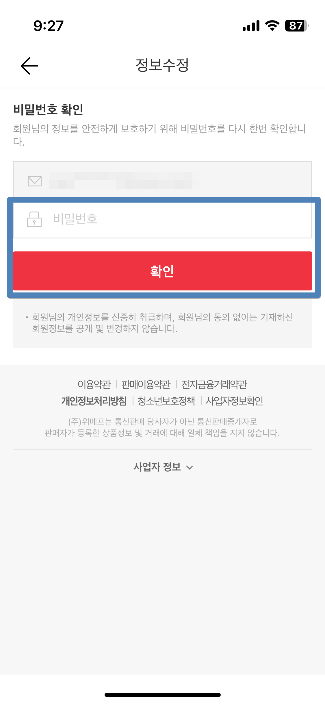 위메프 비밀번호를 입력하고 확인을 클릭합니다.